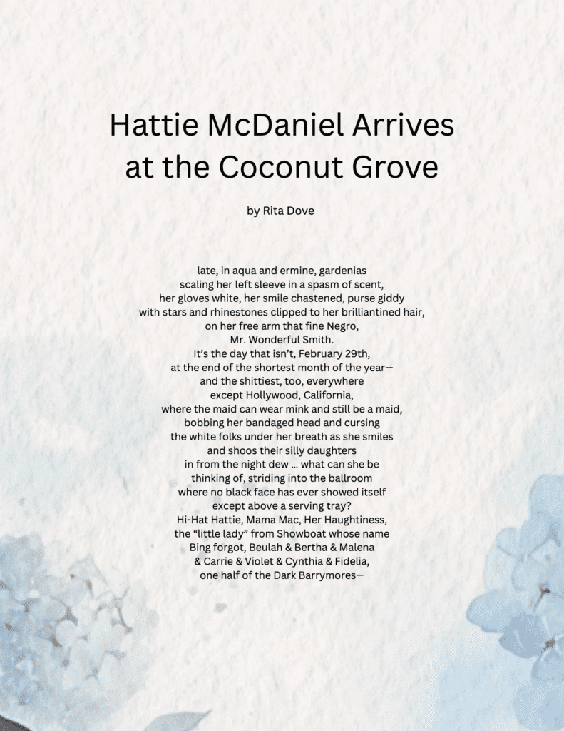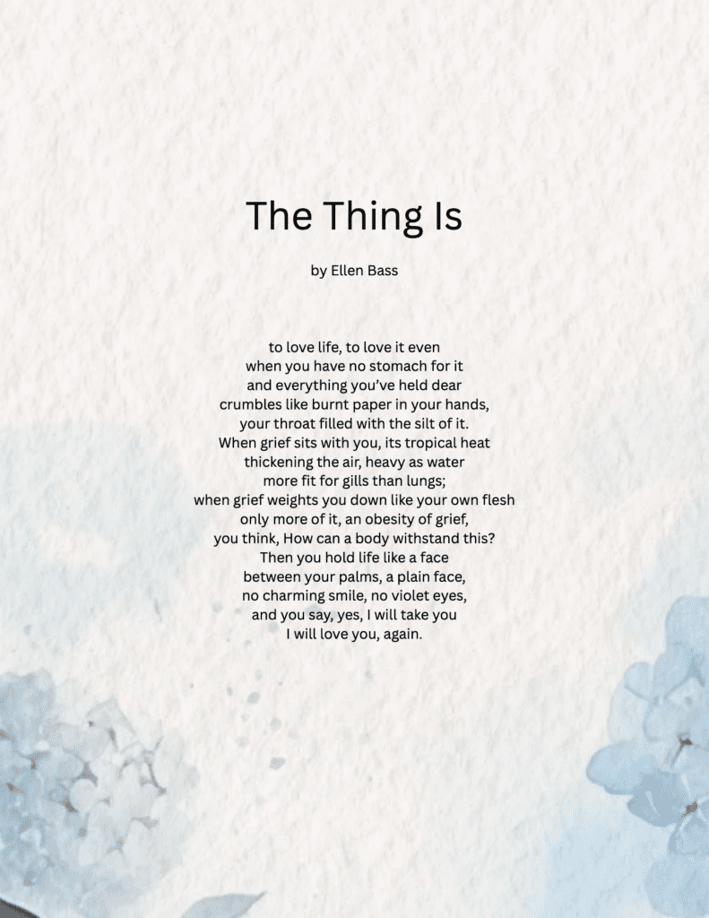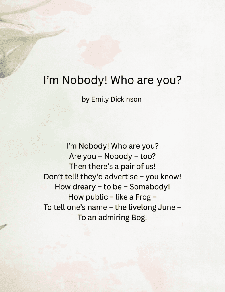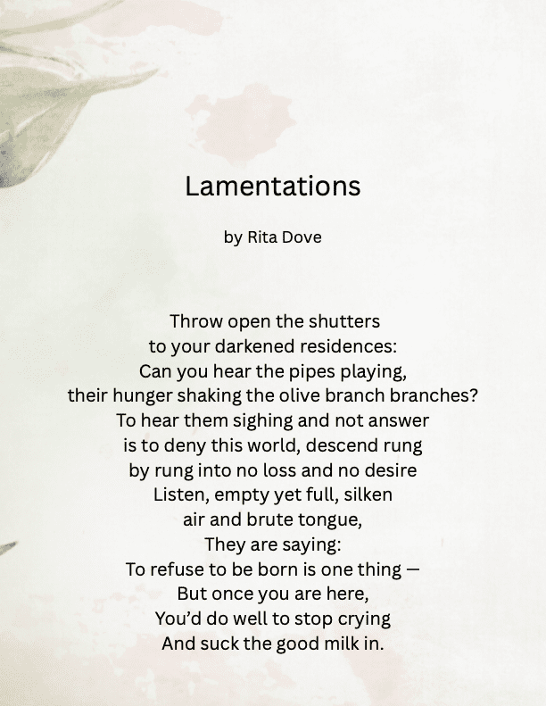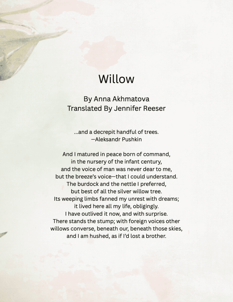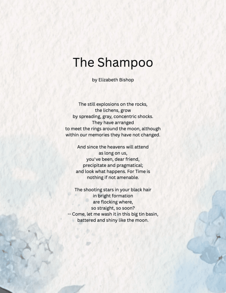 Poems We Love WillowAnna Akhmatova AtlitYehuda Amichai The Other PenelopeKaterina Anghelaki-Rooke Why I Skip My High School ReunionsCraig Arnold My Hair Burned Like BereniceRuth Awad HaikuLi Bai Any Common DesolationEllen Bass The Thing IsEllen Bass How to Be a PoetWendell Berry The ShampooElizabeth Bishop December 20, 2016Michelle Bitting A Musical InstrumentElizabeth Barrett Browning Sonnet VIElizabeth Barrett Browning HaikuYosa Buson why some people be mad at me sometimesLucille Clifton You shall above all things be glad and young…E. E. Cummings ScienceAlison Hawthorne Deming I’m Nobody! Who are you?Emily Dickinson A dead whale can feed an entire ecosystemRachel Dillon Hattie McDaniel Arrives at the Coconut GroveRita Dove LamentationsRita Dove Engaging The Senses Foundation, A 501(c)(3) Organization | All Rights Reserved © 2025
