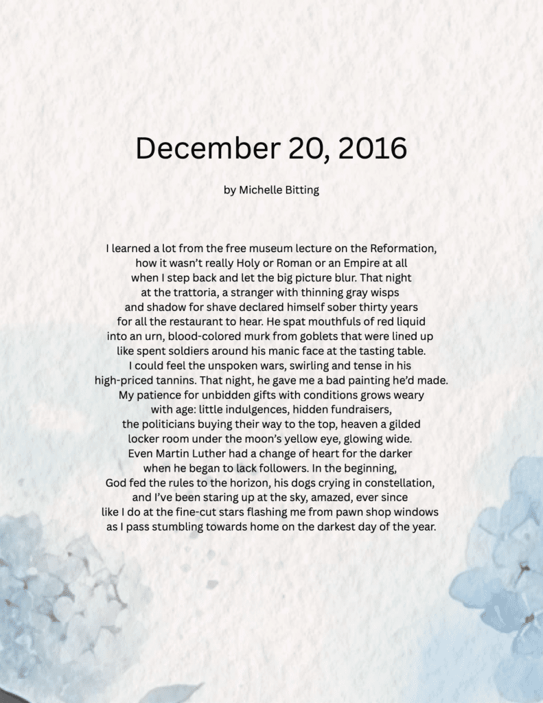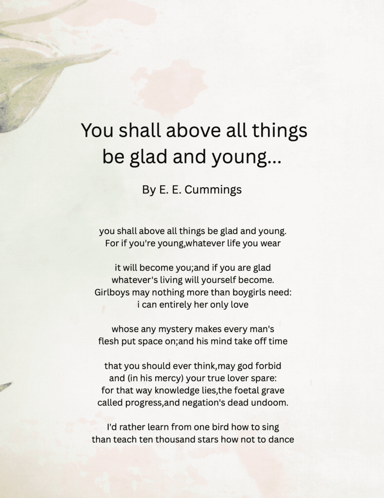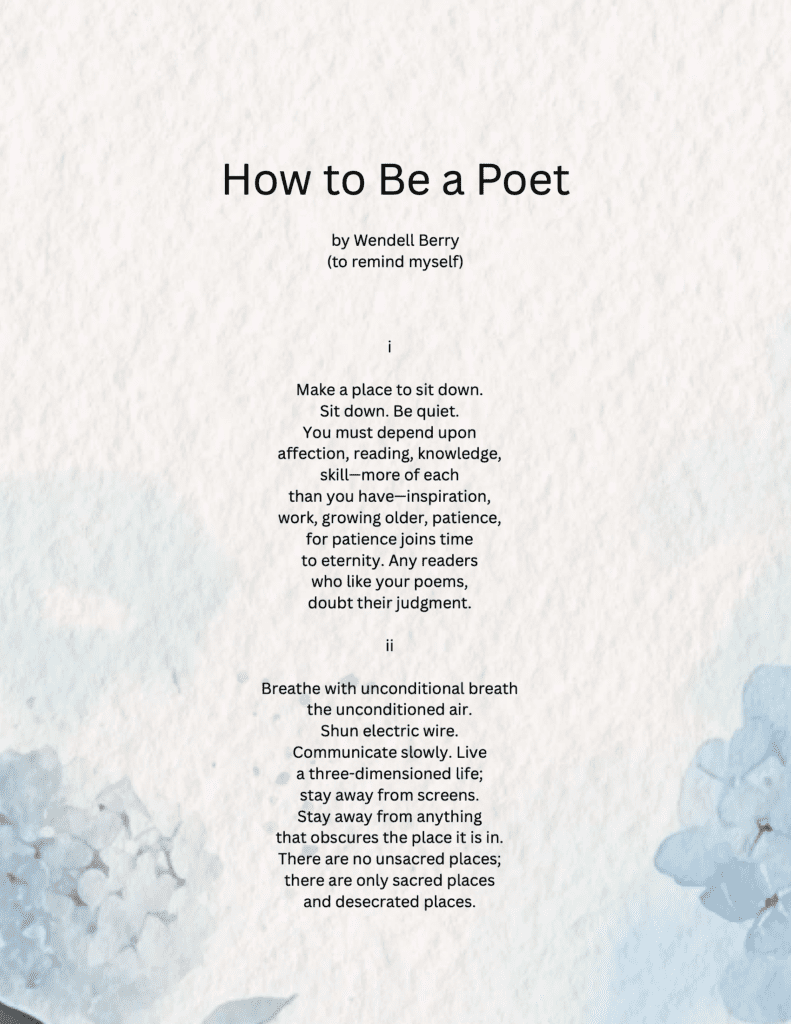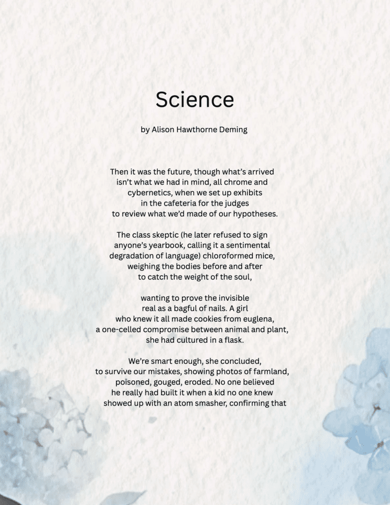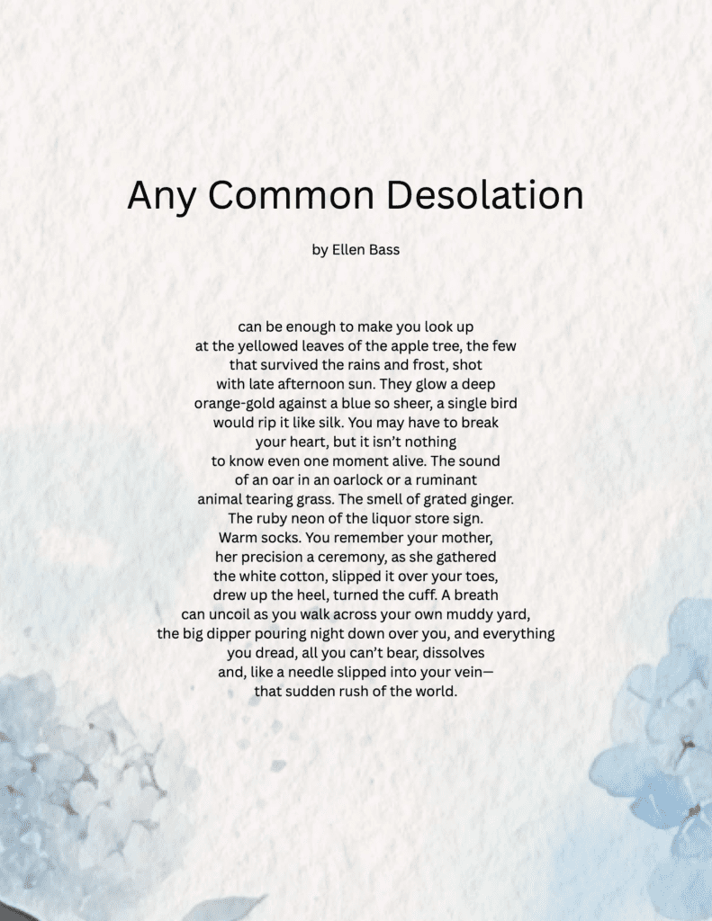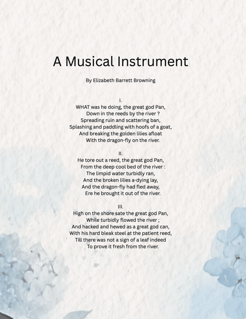 Poems We Love WillowAnna Akhmatova AtlitYehuda Amichai The Other PenelopeKaterina Anghelaki-Rooke Why I Skip My High School ReunionsCraig Arnold My Hair Burned Like BereniceRuth Awad HaikuLi Bai Any Common DesolationEllen Bass The Thing IsEllen Bass How to Be a PoetWendell Berry The ShampooElizabeth Bishop December 20, 2016Michelle Bitting A Musical InstrumentElizabeth Barrett Browning Sonnet VIElizabeth Barrett Browning HaikuYosa Buson why some people be mad at me sometimesLucille Clifton You shall above all things be glad and young…E. E. Cummings ScienceAlison Hawthorne Deming I’m Nobody! Who are you?Emily Dickinson A dead whale can feed an entire ecosystemRachel Dillon Hattie McDaniel Arrives at the Coconut GroveRita Dove LamentationsRita Dove Engaging The Senses Foundation, A 501(c)(3) Organization | All Rights Reserved © 2025